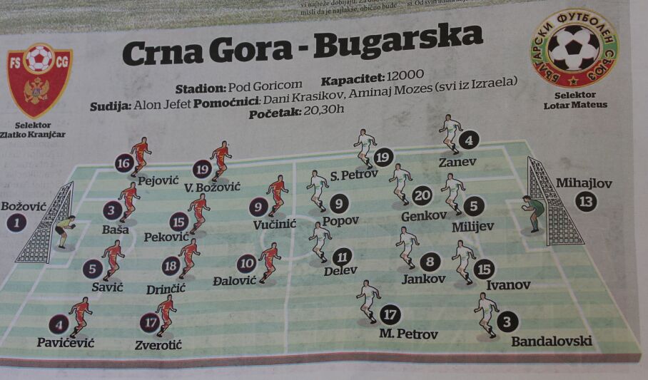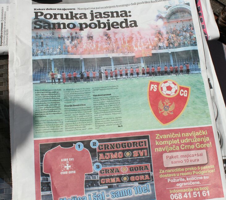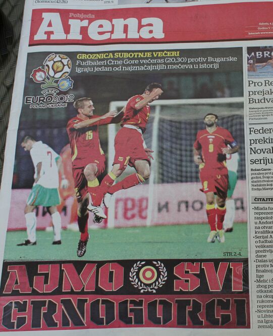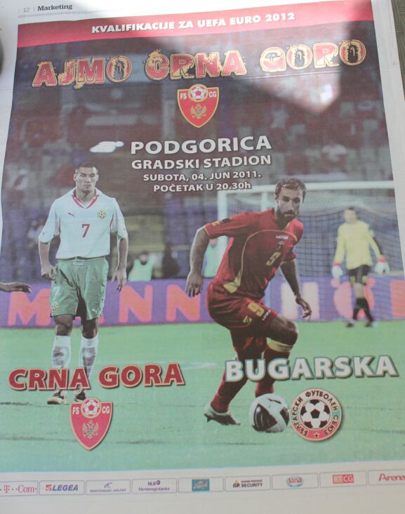 Невероятна еуфория е заляла цяла Черна гора преди тазвечершната европейска квалификация с България на Градския стадион в Подгорица. Медиите в балканската държава изцяло са концентрирани върху срещата, която е историческа за Мирко Вучинич и компания. Както е известно, домакините са лидери в групата, делейки първото място с Англия след три победи и едно равенство от четири срещи. Всичките 12 000 билета за сблъсъка са изкупени, а Златко Кранчар и Вучинич изразиха голям оптимизъм преди двубоя. Спортният всекидневник "Арена" е публикувал огромна снимка на първа страница с радостта при гола на Зверотич донесъл победата в София, придружена с надъхващото заглавие "Ajmo vsi cernogorci" - в превод "Напред всички черногорци". Друг от местните вестници коментира така предстоящата среща: "Само победа". Целият град говори само за срещата днес, а билетите на черно достигнаха цени три-четири пъти по-високи от нормалните от десет евро.