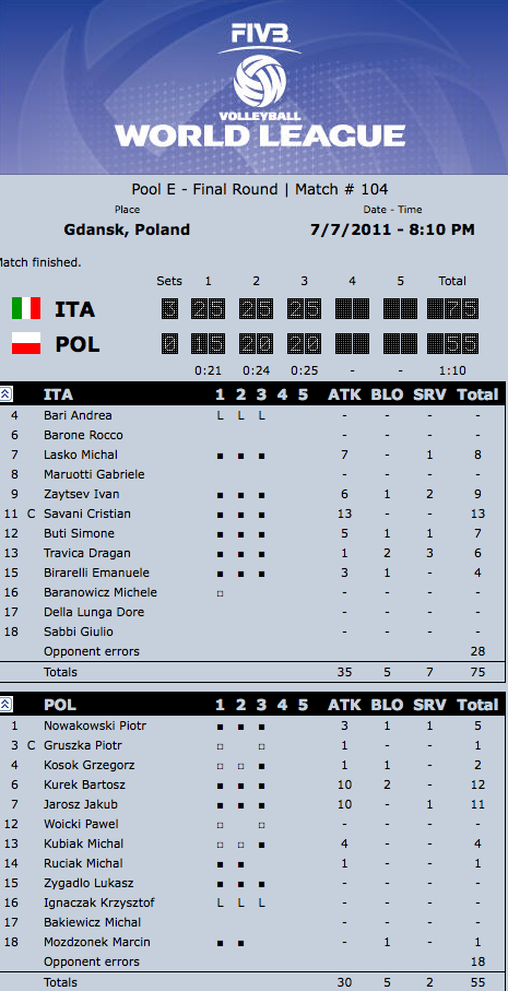 ИТАЛИЯ: Драган Травица 4, Михал Ласко 11, Емануеле Бирарели 4, Симоне Бути 3, Кристиан Савани 8, Иван Зайцев 15 - Андреа Бари-либеро (Габриеле Мауроти, Доре Дела Лунга)