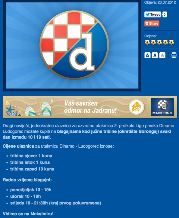 Ръководството на Динамо (Загреб) сложи за реванша с Лудогорец рекордно ниски цени на билети за мач от ШЛ. Феновете на домакините, които искат да изгледат сблъсъка от трибуните "Север" и "Изток" ще трябва да платят точно 1 куна за билет, което се равнява на 26 стотинки. За сравнение една бира в хърватско заведение струва между 2 и 3 евро.