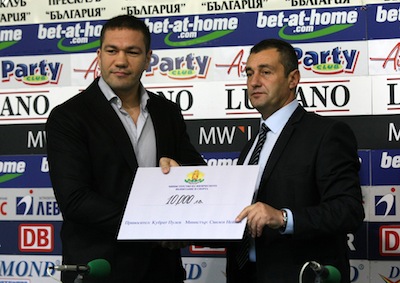 Министърът на физическото възпитание и спорта Свилен Нейков връчи чек с премия от 10 000 лева на Кубрат Пулев - носител на европейската и интерконтиненталната титла в професионалния бокс.