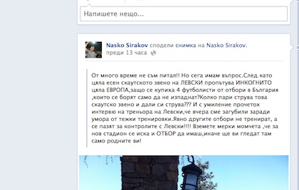 Легендата на Левски Наско Сираков отправи поредната си критика към "сините". Бившият изпълнителен директор в клуба не пести нападки по адрес на тима. В тази връзка преди няколко часа той изрази недоволството си от моментното състояние на отбора. Както често в последно време, той го направи чрез профила си във "Фейсбук". Този път Наско е разочарован от трансферната политика на Левски и дава за пример загубата с 0:2 от играещия във Втора дивизия на Швейцария Аарау в първата зимна контрола.