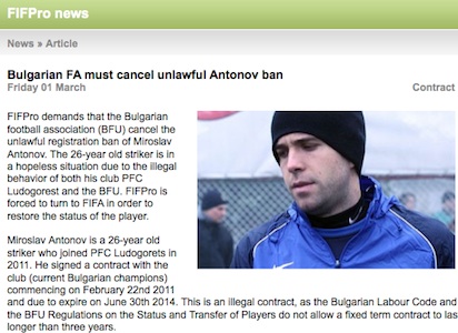 От организацията подчертават, че Антонов е подписал договор с Лудогорец на 22 февруари до 2011 година, чийто срок е до 30 юни 2014 година. „Подобен договор е невалиден, тъй като българският Кодекс на труда и регулациите на БФС относно статута и трансферите на футболистите не разрешават контракти с фиксиран срок, които надхвърлят 3 години“, се казва в изявлението.