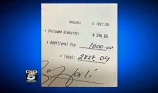 Отборът на Канзас Сити Чийфс надви този на Хюстън Тексанс със 17:16 в мач от редовния сезон на NFL в неделя. По-късно същата вечер играчът на "вождовете" Тамба Хали и 15 негови приятели вечеряли в ресторант "Фого де Чао" в Канзас Сити. Сметката им била 1800 долара, а бакшишът, който оставили - 1000 долара, или 55%!