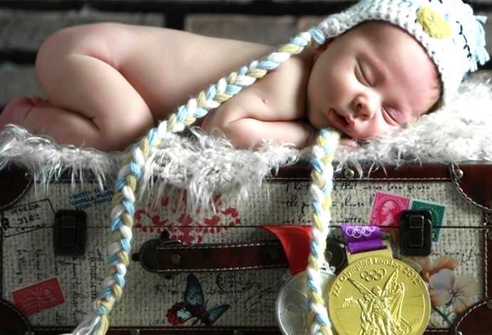 Със снимките Мурильо и Жаклин се похвалиха в социалните мрежи, а от нея се вижда, че малкият Артур се чувства комфортно с отличията от Олимпийските игри в Пекин през 2008 и от Лондон през 2012.