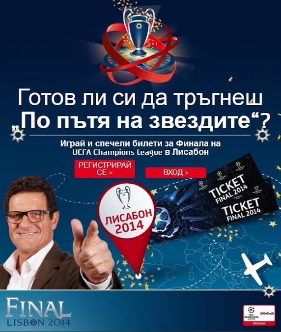 Специално за футболните фенове у нас УниКредит Булбанк стартира игра, посветена на Шампионската лига. УниКредит Булбанк отправя предизвикателство към футболните фенове у нас - до края на април в специално разработена игра те трябва да отговорят на въпросите на италианската легенда Фабио Капело, свързани с историята на най-престижния спортен турнир в Европа.