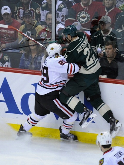Нино Нидерайтер вкара решителния гол, с който Минесота поведе с 3:2 след пас на Спърджън, а след това в третия период самият Спърджън окончателно сложи край на интригата с четвърти гол за отбора на Минесота, който има пет победи от пет мача в плейофите у дома този сезон. Жюстен Фонтен и Джейсън Поменвил вкараха другите голове за Минесота. Патрик Шарп и Михал Хандзус се разписаха за шампионите. Серията се завръща в Чикаго за мач номер 5 в неделя.
