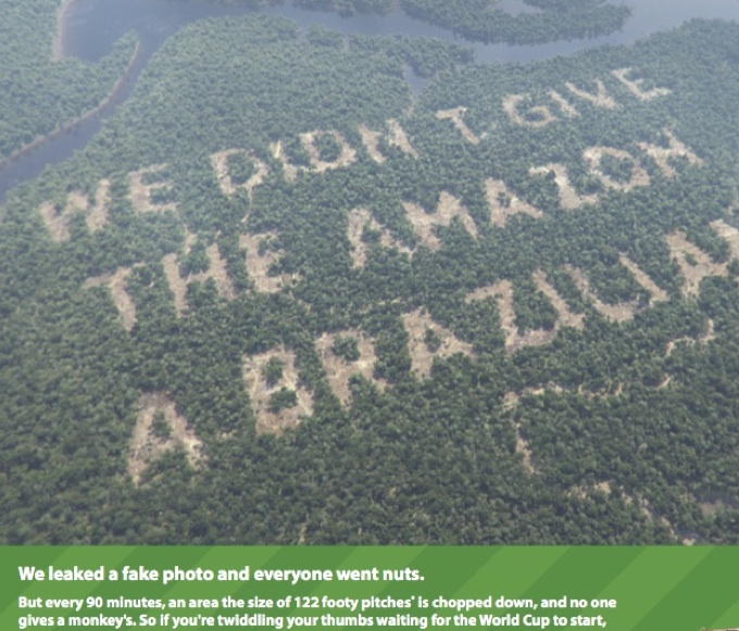 Английският национален отбор по футбол получи странна подкрепа преди началото на Мондиала. Ирлaндският букмейкър Paddy Power реши да надъха "трите лъва" с послание от въздуха. Британската къща пусна снимка на бразилската джунгла с изсечени дървета заради надпис "C'mon England" (б.р. "Напред, Англия").