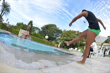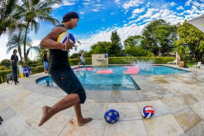 Бразилската футболна звезда Роналдиньо се включи в шоуто на MTV Rota Explosiva и в Интернет вече се появи забавно клипче от участието на 34-годишния играч на мексиканския клуб Керетаро. Вижте как бившият плеймейкър на Пари Сен Жермен, Барселона и Милан цели с топки в главите хора, тичащи в басейн.