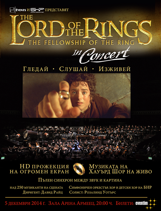 Oстава 1 месец до филмовото зрелище LORD OF THE RINGS IN CONCERT, на което 250 музиканти ще озвучат на живо първата част на трилогията в пълен синхрон с филма в "Арена Армеец". HD прожекцията ще бъде на огромен екран с размерите на триетажна сграда. Швейцарският диригент Давид Райц и любимото сопрано на Хауърд Шор – Кейтлин Луск ще ни отведат на пътешествие от Графството до Средната земя с помощта на симфоничния оркестър, смесен и детски хор на БНР. Българската публика ще има шанса за първи път в Източна Европа да усети магията на двете велики изкуства в едно, благодарение на формата Movie in Concert, който обединява музика и кино в една перфектна симбиоза.