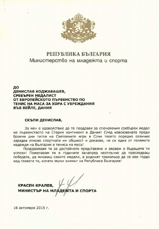 "Скъпи Денислав, за мен е удоволствие да те поздравя за спечеления сребърен медал на първенството на Стария континент в Дания! След извоюваната преди броени дни титла на Световните игри в Сочи твоето поредно отличие зарадва отново спортната ни общност и доказва, че си една от големите надежди на България в тениса на маса!