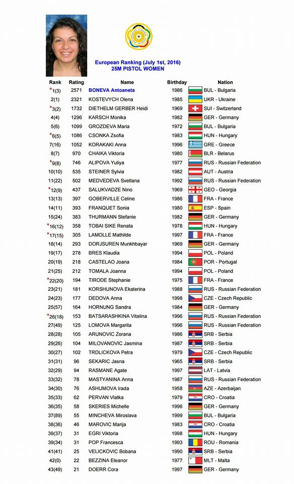 Носителката на Световната купа по спортна стрелба на 25 метра пистолет за 2016 г. Антоанета Бонева е №1 в ранглистата на Европа в тази дисциплина към 1 юли. Родената в Търговище състезателка спечели Световната купа в края на миналия месец в Баку, когато в изключително драматичен финал беше по-точна от гъркинята Анна Коракаки (7:5). В същата класация българката с най-много олимпийски отличия Мария Гроздева е пета. Голям скок напарви девойката Мирослава Минчева, която от 89-а позиция се изкачи до №37 в ранглистата на Стария континент. Минчева, която също е от Търговище, спечели сребърен медал на 25 м пистолет на Европейското първенство за девойки в Талин (Естония) в средата на юни.