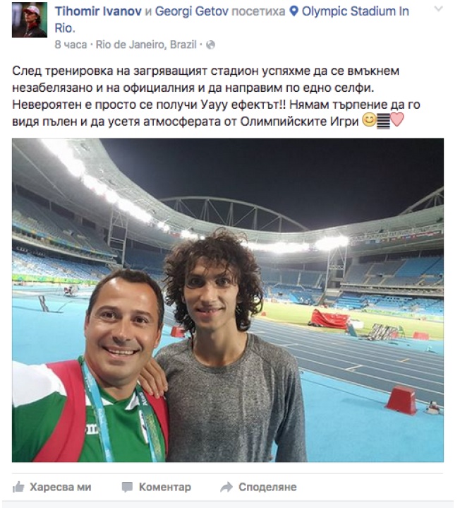 "След тренировка на загряващия стадион успяхме да се вмъкнем незабелязано и на официалния и да направим по едно селфи. Невероятен е, просто се получи Уауу ефектът!! Нямам търпение да го видя пълен и да усетя атмосферите от Олимпийските игри", написа Тихомир Иванов.