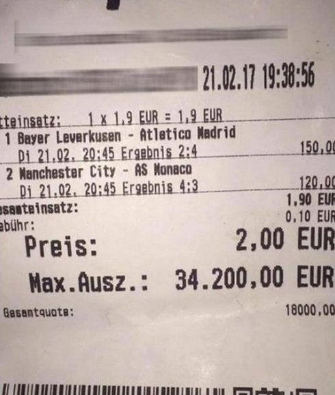 Футболен запалянко в Германия се размина с огромна печалба от 34 200 евро срещу само 2 евро заложени за точен резултат на мачовете от Шампионската лига във вторник. Около час преди началото на двубоите той заложил, че Байер (Леверкузен) ще загуби от Атлетико Мадрид с 2:4, а Манчестър Сити ще спечели срещу Монако с 4:3. Първата му прогноза излиза - 4:2 за испанците, но втората му "избяга" за 8 минути, след като Сити надви с 5:3. До 82-ата минута на "Етихад" резултатът беше точно 4:3, но тогава германският национал Льорой Сане заби петото попадение.