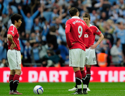 Манчестър Сити победи с минималното 1:0 градския си противник Ман Юнайтед в полуфинала на ФА Къп с попадение на Туре Яя в 52-ата минута и по този начин прекрати надеждата на "червените дяволи" да повторят требъла си от 1999 година. Африканецът отбеляза след поредица от грешки от страна на Ван дер Сар и Майкъл Карик, които му подариха топката при изнасяне на коженото кълбо напред. Туре нахлу мощно в наказателното поле и с удар под плонжа на Ван дер Сар отбеляза за 1:0. В 72-ата минута "червените дяволи" останаха и с човек по-малко на терена, след като Пол Скоулс бе отстранен с директен червен картон заради брутално влизане в краката на Пабло Сабалета.