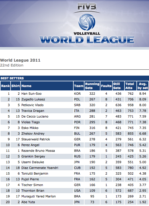 Андрей Жеков се изкачи с една позиция нагоре в класацията на най-добрите разпределители в Световна лига след 5-ия от груповата фаза на надпреварата. Жеков има по 6.68 перфектни паса средно на гейм, което го поставя на 8-мо място в класацията. Лидер продължава да бъде кореецът Хан Сун-Су с 8.94, следван от поляка Лукаш Зигадло с 8.09 и сърбина Владо Петкович с 8.00.