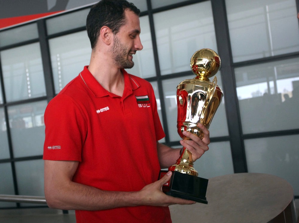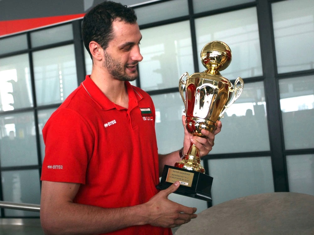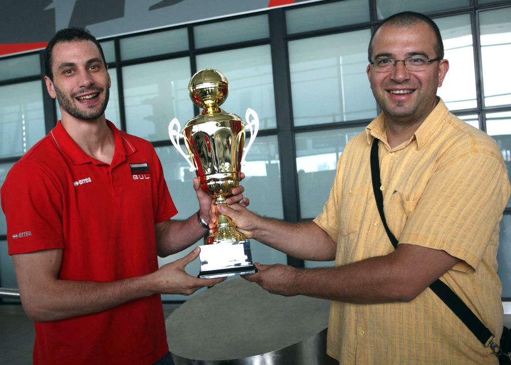 Екип на Sportal.bg връчи днес наградата на победителя Матей Казийски - специално изработена купа! Това стана по време на пристигането на националния отбор на България от Полша, където Матей Казийски, Владо Николов и съотборниците им заеха 5-то място на финалите в Гданск.