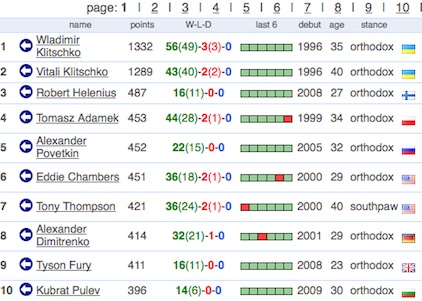 Пръв в ранглистата е Владимир Кличко (35 г.), следван от брат си Витали (40). Следват германецът Роберт Хелениус (27), полякът Томаш Адамек (24) и руснакът Александър Поветкин (32). Преди Пулев са също така Еди Чембърс (САЩ, 29), Тони Томпсън (САЩ, 40), Александър Димитренко (Германия, 29) и Тайсън Фюри (Великобритания, 23).