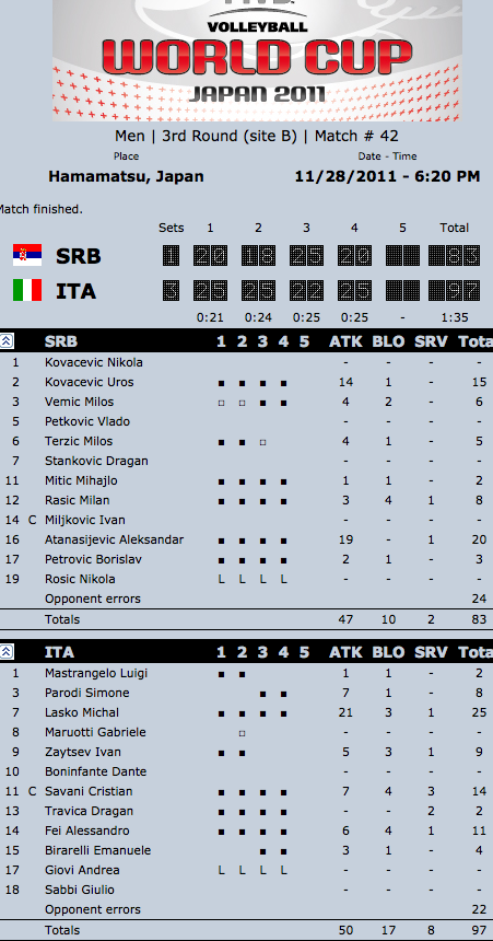 СЪРБИЯ: Урош Ковачевич 15, Милош Терзич 5, Михайло Митич 2, Александър Атанасийевич 20, Борислав Петрович 3, Милан Рашич 8 (1 ас, 4 блока) - Никола Росич-либеро (Милош Вемич 6)