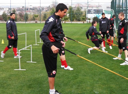 Те преминаха през няколко станции на изометрично натоварване на мускулите и спринтове, които трябва да подобрят координацията на движенията им. Интересен за наблюдаване бе методът за изометрично натоварване (бел. ред. - без допълнително разтягане на мускулите), при който футболистите бяха вързани през кръста с ластици, които трябваше да им оказват нужното съпротивление.