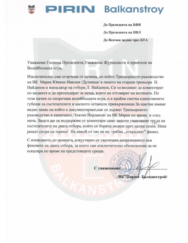 В късните часове на последния почивен ден, свързан с Великденските празници, на редакционната поща на BGvolleyball.com бе изпратено отворено писмо от Пирин Балканстрой в отговор на нападките. То е адресирано до президента на федерацията инж. Данчо Лазаров и президента на НВЛ Красимир Илиев. Ето го и цялото писмо:
