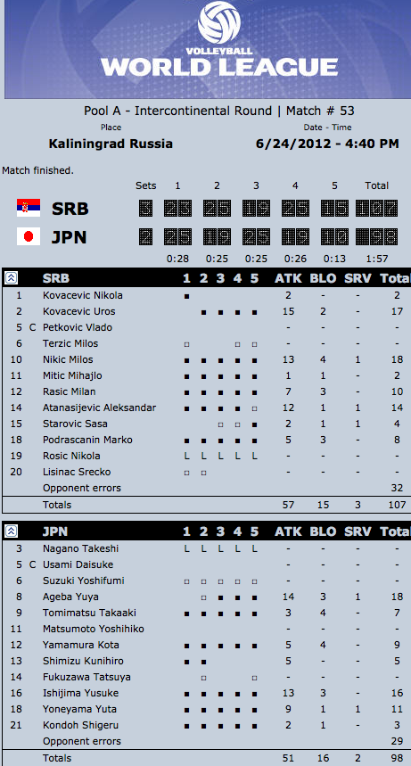 Европейските шампиони от Сърбия постигнаха трудна победа над Япония с 3:2 (23:25, 25:19, 19:25, 25:19, 15:10) в мач от 3-ия кръг на турнира в Калининград от Група А на Световната лига.