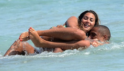 Халфът на Милан Кевин-Принс Боатенг продължава слънчевата си ваканция на остров Ибиса. След като двамата с годеницата му Мелиса Сата бяха заснети от папараци на луксозна яхта в компанията на свои приятели преди няколко дни, сега те за пореден път демонстрираха любовта си пред погледите на всички плажуващи. Двамата не спряха да се гушкат и да се боричкат във водата, а италианската моделка отново бе с доста изрязан бански, който събра погледите на мъжете.