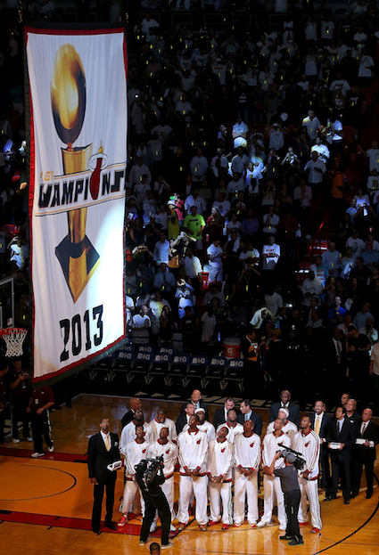 Маями Хийт започна сезон 2013/2014 по най-добрия възможен начин, побеждавайки у дома в "Американ Еърлайнс Арина" Чикаго Булс със 107:95 в първия мач на Дерик Роуз след 18-месечно отсъствие. На специална церемония преди срещата "горещите" получиха шампионските си пръстени, а след това дадоха начало на дългоочакваното от фенове и специалисти баскетболно шоу, наречено НБА.