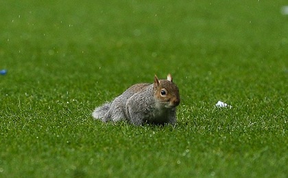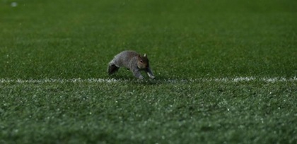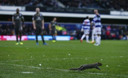 Катеричка прекъсна за кратко мача от Чемпиъншип (второто ниво на английския клубен футбол) между Куинс Парк Рейнджърс и Лестър. Симпатичният гризач бе подгонен на терена на стадион "Лофтъс Роуд" от нападателя на "лисиците" Дейвид Нюджънт. Последният не успя да се разпише в противниковата врата, но Лестър спечели дербито с 1:0 като гост с попадение на Джейми Варди в 41-ата минута. Пет минути преди края пък скандалният халф на КПР Джоуи Бартън получи втори жълт, съответно червен картон.