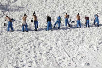 След мъглата рано сутрин небето постепенно се изчиства и отстъпва място на жаркото слънце. А спортистите показват все повече плът. Затова са и толкова много необичайните за бяла олимпиада гледки. Вчера американецът Боби Браун се пусна по фланелка в битката за медалите в дисциплината слоупстайл на ските-свободен стил.