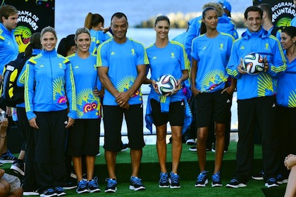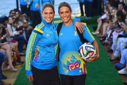 Близначките Биа и Бранка Ферес, които са състезателки по сихронно плуване, представиха екипите за доброволците на световното първенство по футбол в Бразилия това лято.