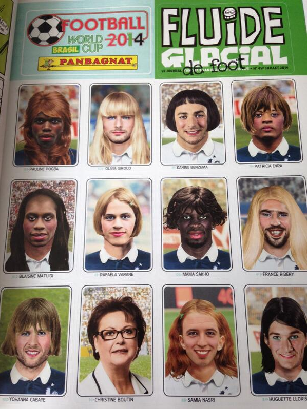 Френското издание "Флюид Гласиал", известно със своите скандални карикатури, в навечерието на Мондиал-2014 представи футболистите от френския национален отбор като жени. Фоторедакторите на "Флюид Гласиал" майсторски "нарисуваха" на футболистите перуки, начервиха им устните, а също така превърнаха имената им в женски. Така например Пол Погба е станал Полин Погба - брюнетка с тъмнокестенява коса, която пада на раменете й. Рафаел Варан пък е станал Рафаела Варан - очарователна блондинка с яркочервени устни. Франк Рибери е Франс Рибери - красавица с пищна и буйна руса коса и с мустаци и брада на кралски мускетар...
