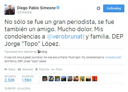 Аржентинският наставник на "дюшекчиите" изрази тъгата си в социалната мрежа и написа следното: "Отиде си не само голям журналист, но и голям приятел. Болката е голяма. Моите съболезнования на Вероника Брунати и всички роднини. Почивай в мир, Хорхе "Топо" Лопес".