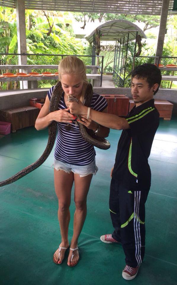 Двукратната европейска шампионка в скока на дължина в зала и бронзова медалистка от шампионата на Стария континент в Цюрих на открито Даря Клишина се наслаждава на заслужена ваканция. Сексапилната рускиня се отдаде на почивка и забавления в Тайланд, като непрекъснато информира своите фенове със снимки в официалната си страница във Фейсбук. 23-годишната атлетка помести и две много любопитни снимки - на едната позира със слонче, а на другата целува змия, която се е увила около врата й. Клишина не подмина и водните снимки на плажа, с които зарадва многобройните си почитатели от мъжки пол.