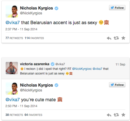19-годишната тенис сензация Ник Кирьос, който елиминира носителя на 14 титли от Големия шлем Рафаел Надал на 1/8-финалите на "Уимбълдън", флиртува с бившата номер едно в света Виктория Азаренка. Австралиецът написа на стената на беларуската тенисистка в "Туитър", че акцентът й е много секси, след което й направи комплимент, че е "сладка". "Вика, този беларуски акцент е просто толкова секси", публикува тийнейджърът в социалната мрежа. "Признавам си :)", бе отговорът на двукратната шампионка от Australian Open, която наскоро се раздели с приятеля си Redfoo и освен това е с 6 години по-голяма от Кирьос. "Сладка си", завърши разговорът тенисистът.