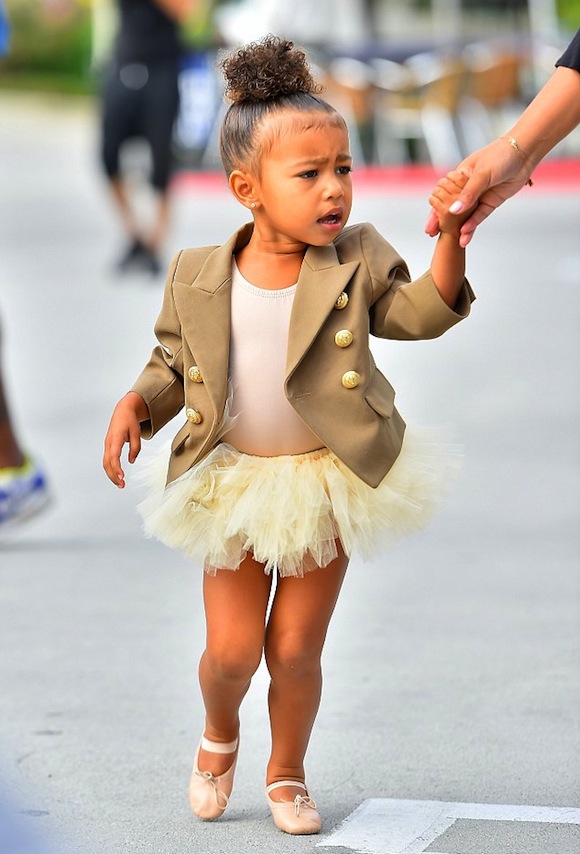 "Казах без снимки", заяви Норд Уест със сладкото си гласче и започна да прави гримаси на отегчение досущ като звездната си майка. Малката отиваше на репетиция по балет и беше облечена с туту, обута с цвички, а косичката й - прибрана на кок. Тоалетът на момиченцето се допълваше от сако на Balmain, един от любимите брандове на Ким.