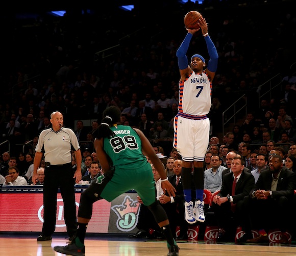 Неприятната новина за домакините обаче бе свързана с контузията на звездата на тима Кармело Антъни, който напусна през третата част с изкълчен глезен и до края не се завърна на терена. Въпреки това Мело завърши със 17 точки, а в негово отсъствие изпъкна новобранецът Кристапс Порзингис. 20-годишният латвиец изигра поредния си много силен мач и приключи с 26 точки и 6 борби.