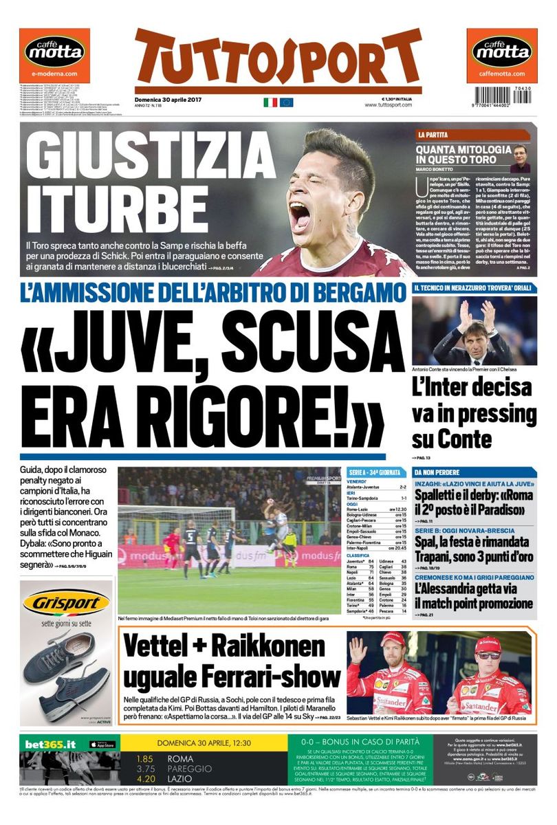 По принцип съдиите рядко признават грешките си, особено когато са в ущърб на Ювентус и затова признанието на Гуида намери място на първа страница на "Тутоспорт".