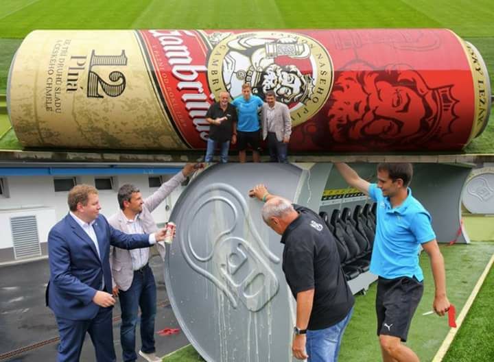 Чешкият гранд Виктория (Пилзен) влезе в историята не с някое футболно постижение, а с невероятен пример за атрактивен маркетинг и взаимоотношение със спонсорите. Докато някои отбори се чудят как да шарят екипите си с лога на фирмите, които ги финансират, други намират оригинален начин да направят отлична реклама на нещо любимо на всички фенове - бирата. Ето как вече изглеждат резервните скамейки на стадиона на Виктория (Пилзен):