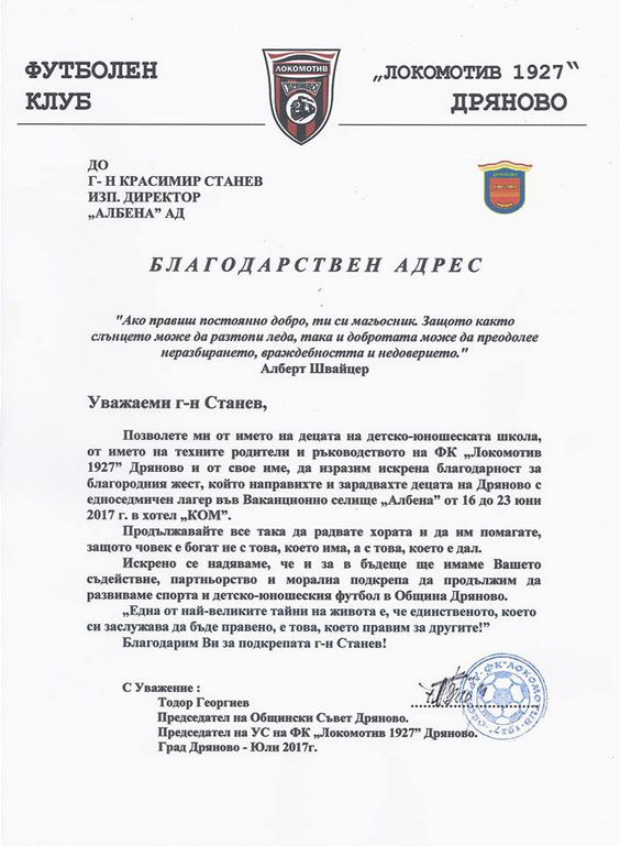 "Позволете ми от името на децата на детско-юношеската школа, от името на техните родители и ръководството на ФК Локомотив 1927 Дряново и от свое име, да изразим искрена благодарност за благородния жест, който направихте и зарадвахте децата на Дряново с едноседмичен лагер във Ваканционно селище "Албена" от 16 до 23 юни 2017 г. в хотел „КОМ”. Продължавайте все така да радвате хората и да им помагате, защото човек е богат не с това, което има, а с това, което е дал. Искрено се надяваме, че и за в бъдеще ще имаме Вашето съдействие, партньорство и морална подкрепа да продължим да развиваме спорта и детско-юношеския футбол в Община Дряново. „Една от най-великите тайни на живота е, че единственото, което си заслужава да бъде правено, е това, което правим за другите!” Благодарим Ви за подкрепата г-н Станев!