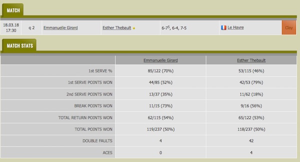 Невероятните 42 двойни грешки допусна френската тенисистка Естер Тебо в мача си със своята сънародничка Еманюел Жирар от квалификациите на турнира от календара на ITF в Льо Авър с награден фонд 15 000 долара. Жирар, която направи само 4 двойни грешки, спечели с 6:7 (5), 6:4, 7:5. Не можем да кажем със сигурност дали огромният брой двойни грешки на Тебо е рекорд, но във всеки случай тази статистика е шокираща.
