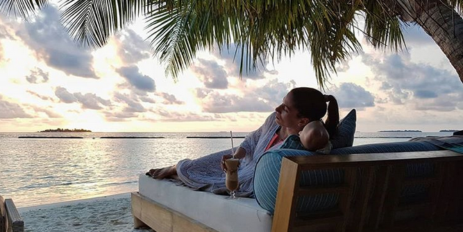 Шпанович публикува и снимка с коктейл в ръка на плажа, полегнала на шезлонг и наблюдавайки залеза.