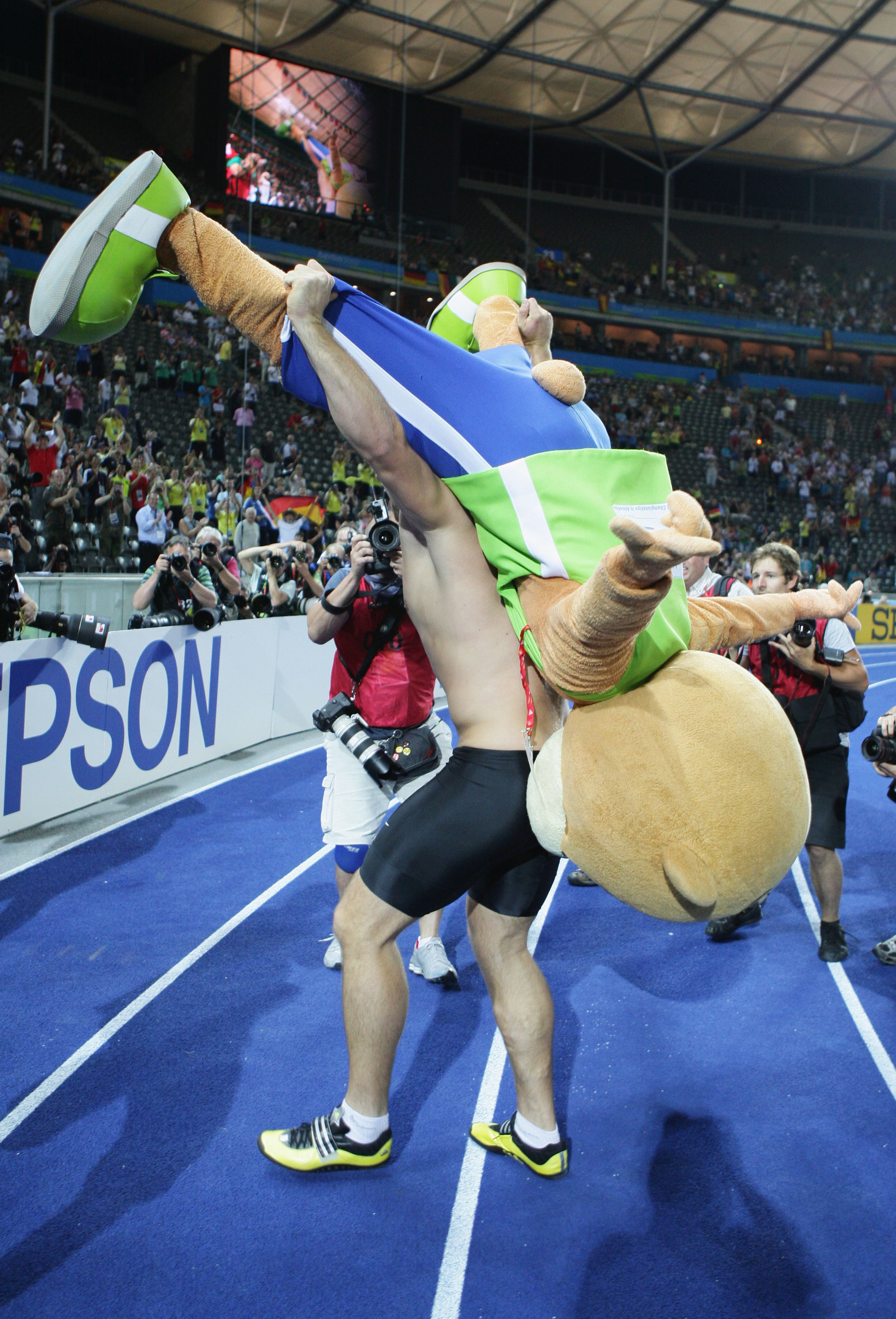 Хартинг и Берлино имаха запомнящи се срещи през 2009 г., но със сигурност най-емоционалната беше на финала в мятането на диск, когато Хартинг спечели титлата и понесе своя приятел талисман на гръб.