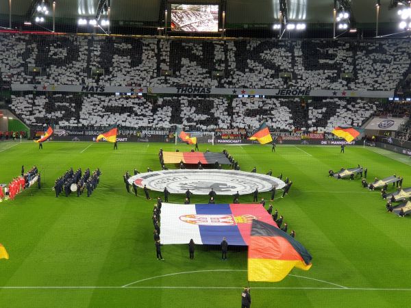 Хореографията на германските фенове беше посветена на Матс Хумелс, Жером Боатенг и Томас Мюлер, които вече не попадат в плановете на Льов. С помощта на черни и бели картони на една от трибуните беше изписано "Благодарим", а вместо имената на тримата футболисти, привържениците издигнаха номерата им - 5, 13 и 17.