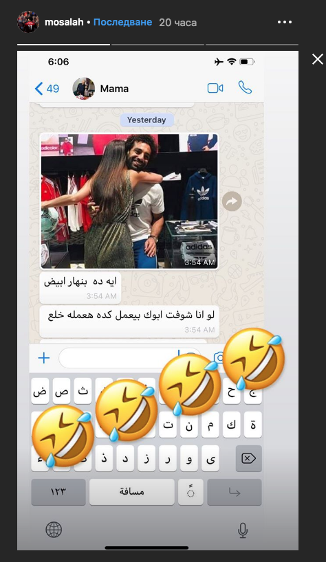 Острието на Ливърпул Мохамед Салах сподели как майка му не одобрява негова снимка от скорошно рекламно събитие. На него нападателят е заснет със своя фенка. Следва обаче недоволство от страна на мама и това се вижда от размяната на съобщения между двамата.