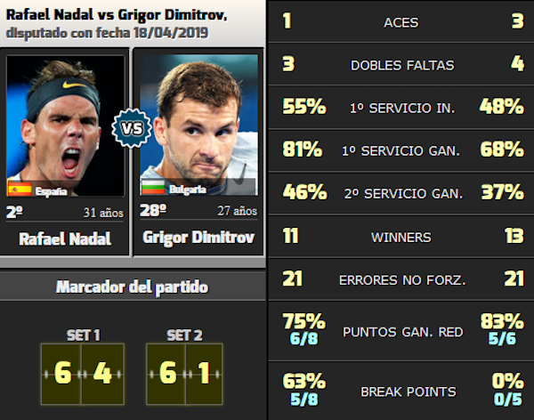 Григор сложи край на серията на съперника си с гейм на нула, а веднага след това се пребори и за първата си точка за пробив в мача. Надал я заличи с брутален форхенд, но след това допусна нехарактерна за него двойна грешка. При следващата точка Рафа отново допусна лесна грешка, този път аут от форхенд след опит да направи уинър. Това озанчаваше пробив за Димитров и българинът се върна в битката за първия сет.