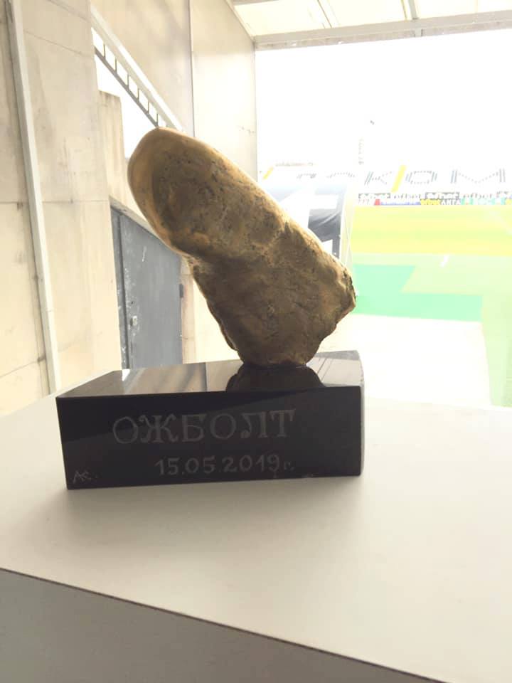 Именно такава е идеята на склуптурата - да увековечи паметния момент. От Локо Пд твърдят, че тя е направена след отливка от петата на Ожболт, а под нея е изписана паметната дата 15 май 2019 година.