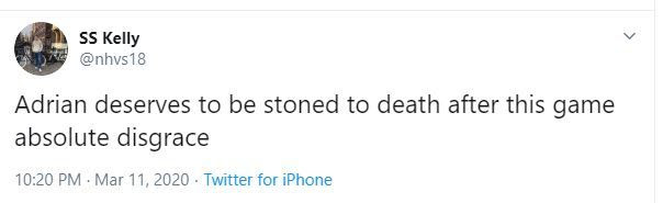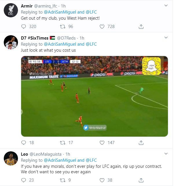 Вратарят Адриан, който направи ужасяваща грешка при първия гол на Атлетико Мадрид, във вчерашния футболен спектакъл от Шампионската лига, стана обект на онлайн тормоз. Гневни фенове на Ливърпул го засипаха с критика и поставиха под съмнение професионалните му качества. Някои го обявиха за издънка на Уест Хам, която няма място в шампионския състав на Ливърпул. Адриан дори беше призован, ако има морал, да се откаже от договора си с Ливърпул. Други мърсисайдци заявиха, че стражът трябва да бъде пребит с камъни заради нелепата си грешка. След мача мениджърът Юрген Клоп заяви на пресконференцията, че Адриан няма вина за загубата.
