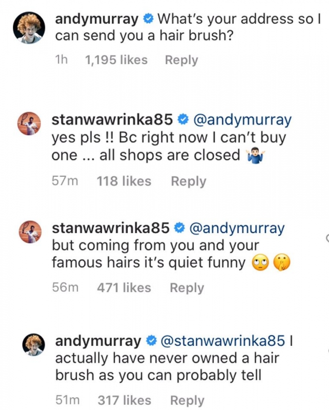 „Какъв е адресът ти, за да мога да ти изпратя четка за коса“, написа под снимката Мъри. Отговорът на Вавринка не закъсня: „Да, моля! Защото точно сега не мога да си купя нито една…всички магазини са затворени.