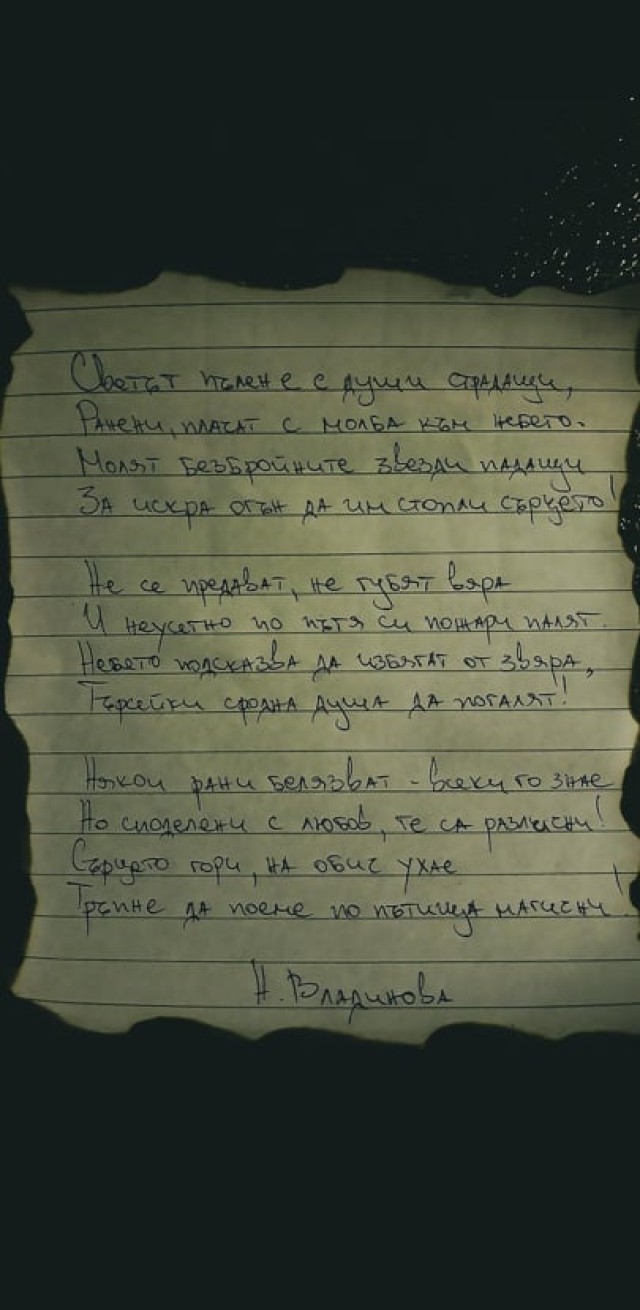 Оказва се обаче Невяна успява да съчетае не две, а цели три често смятани за несъвместими дисциплини – спорт, математика и.....поезия. Гиманстичката публикува свое стихотворение в социалните мрежи. Неозаглавеното произведение е емоционално. Продукт на безсънна нощ, в която Неви не може да заспи, но пък получава вдъхновение да пише. Излива емоциите си на хартия, за да ги превърне в докосваща творба. Провокирана от размишления със самата себе си и наблюдения към околния свят, които не й дават мира, Владинова намира лек в поезията, чрез която отваря още малко от завесата към всичко бушуващо в душата й.
