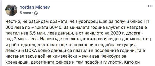Бившият главен редактор на "Дума" Йордан Мичев защити ПФК Лудогорец, който кандидатства за финансиране по мярката 60/40 и беше одобрен да получи държавната подкрепа. Журналистът скочи на феновете в социалните мрежи, които изразиха недоволство, че шампионите са получили помощ, като дори се заяде с грандовете Левски и ЦСКА.